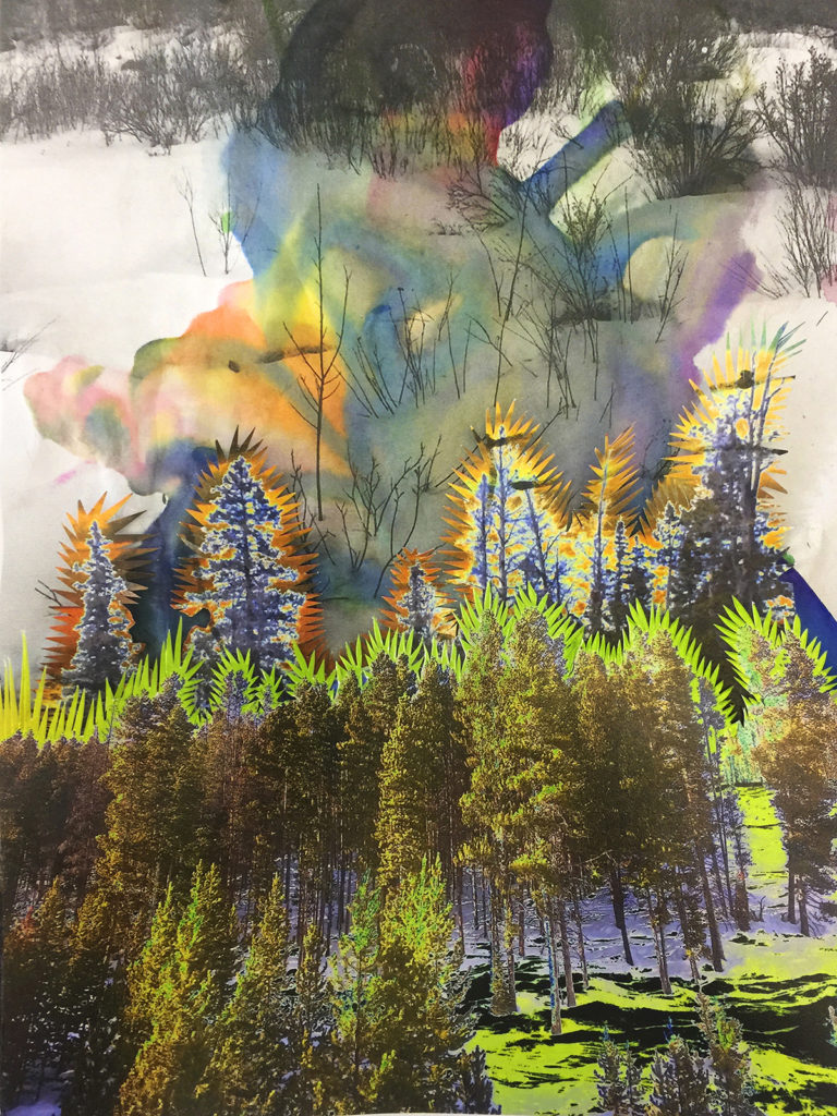 "My work is inspired by the Colorado Rockies landscape, the old dilapidated mines spread throughout, and the push-pull relationship between human use of landscape and the land constantly reclaiming itself. The work is also heavily influenced by my own sense of spirituality in relation to nature, as I reflect upon the “conversations” I have with the mountain while exploring new terrain, challenging athletic endurance, facing fears and limitations, and decompressing mental setbacks. Through abstraction in photography, mixed media and collage I strive to portray something more about a landscape than the way it literally appears. My aim is to hint at an ephemeral experience, to suggest multiple points of time, or perhaps imply landscape as a whimsical “beast” constantly in motion."